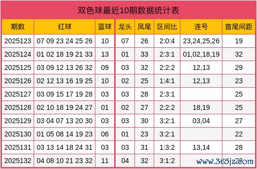 双色球第2025132期奖号为:04、08、10、21、23、32 + 11,其中红球号码奇偶比为2:4,大小比为3:3,012路比为1:2:3,三区比为3:1:2。